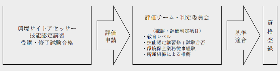 この制度(※)は、講習と評価・認定登録から成り、講習は、環境サイトアセッサーに必要な知識とアセスメント(地歴調査等による初期評価)技能の修得を目的とし、その修得(修了試験合格)は、環境サイトアセッサー資格取得のための主要な要件となっています。